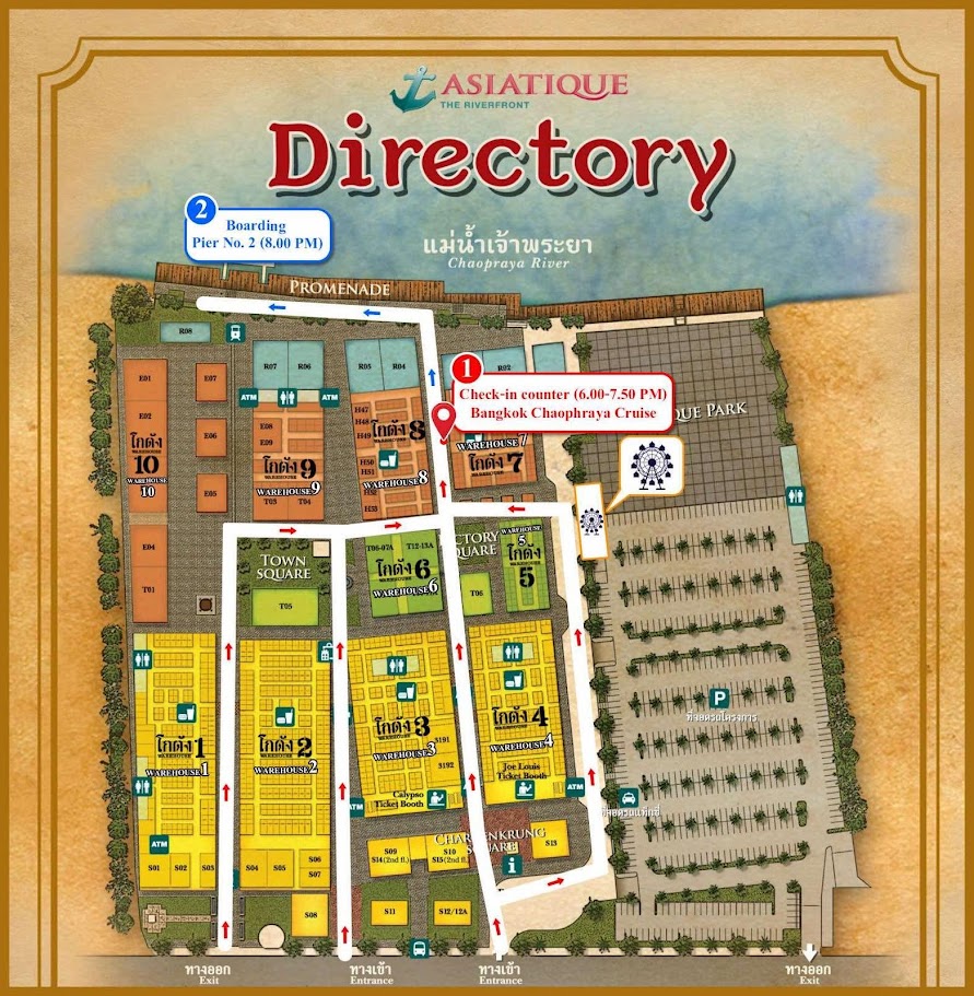จุดเช็คอิน-EngYour check-in for the "Bangkok Chao Phraya Cruise" is at the walkway, specifically positioned between Warehouse #7 and #8 at Asiatique The Riverfront